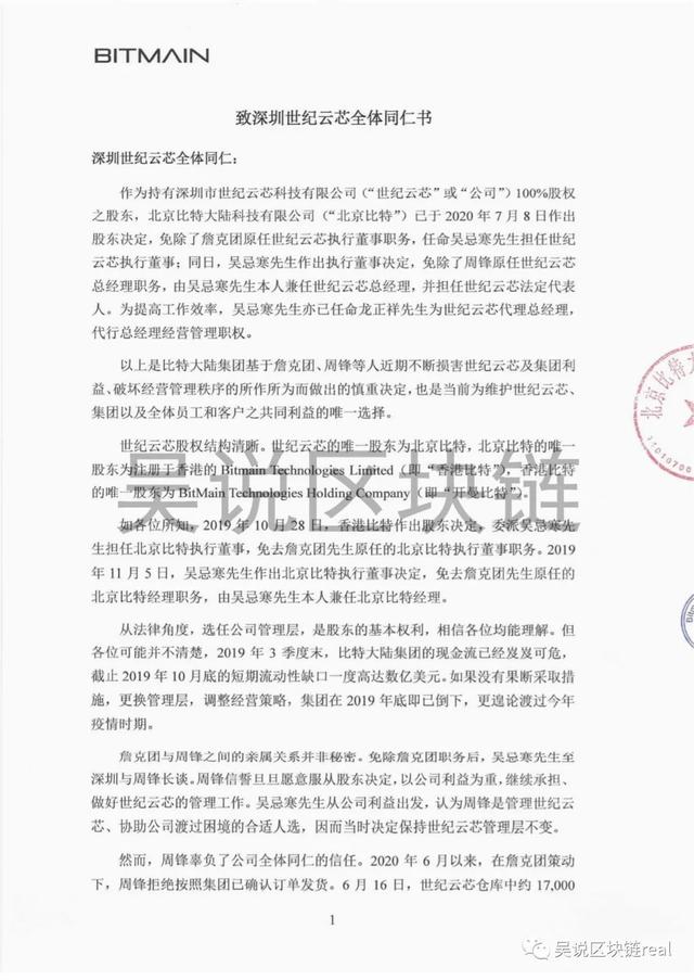 吴说区块链获得的一封7月13日吴忌寒发布的内部信长文,严厉批评近来詹克团的行为,透露大量细节,如: