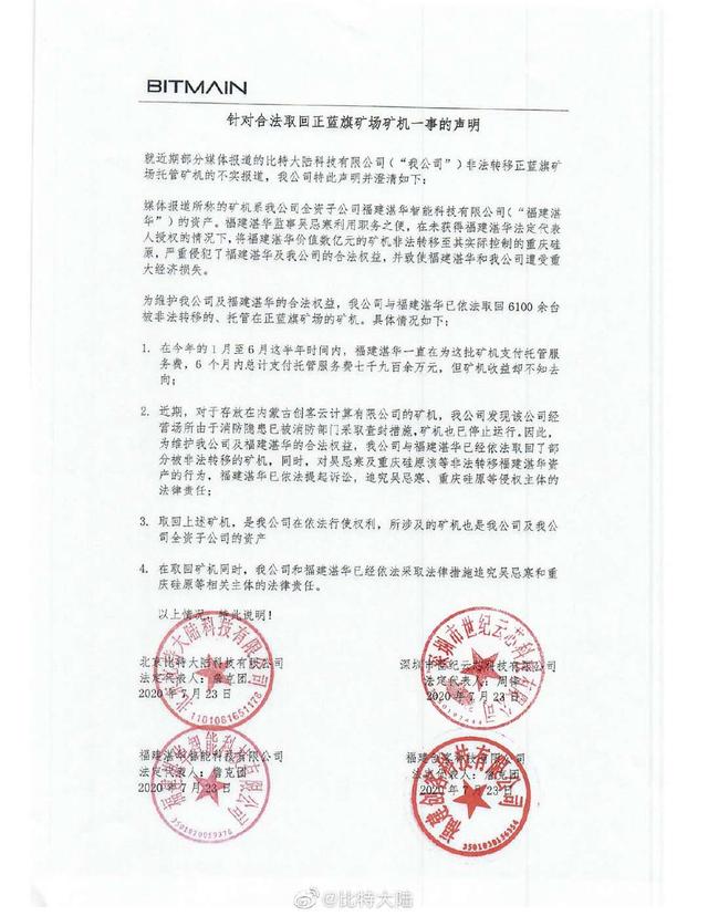 针对“抢”矿机一事,詹克团方面发出了回复,称“抢”的矿机产权是北京比特的子公司福建湛华所有,而吴忌寒将产权转移给了新加坡比特的子公司重庆硅原所有,但这些公司都是开曼比特的子公司。所以一团乱账,各说各有理。