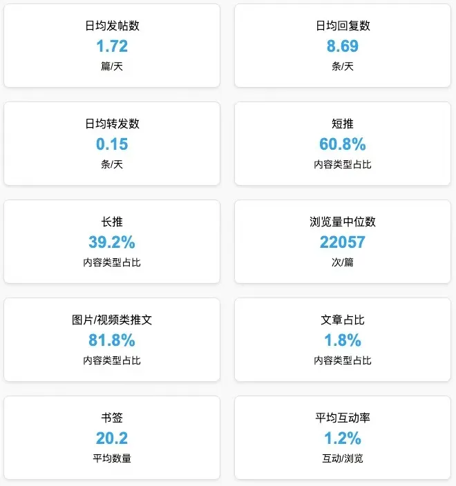 从传播效果来看,单条推文浏览量中位数达 22,507,具备较强触达力;此外,平均每条推文获得 20.2 次书签收藏,说明其信息价值被认可并被用于后续参考。