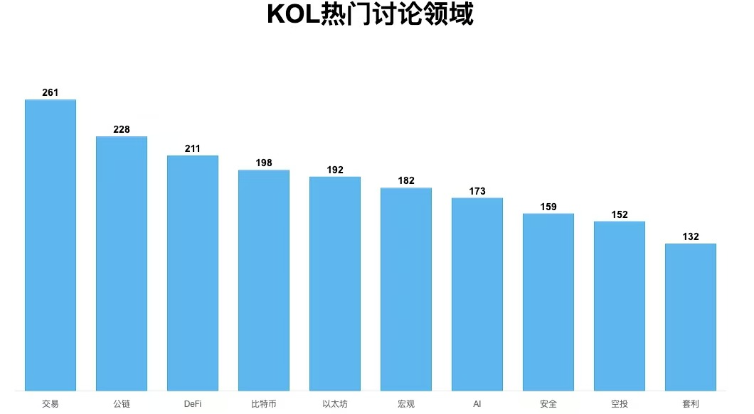 KOL 热门讨论领域的统计基于前 300 位 KOL 的能力模型。每位 KOL 的模型通过其推文内容分析,提炼出八个最具代表性的能力,再将这 300 位 KOL 的能力频次加总,最终形成该分布图。