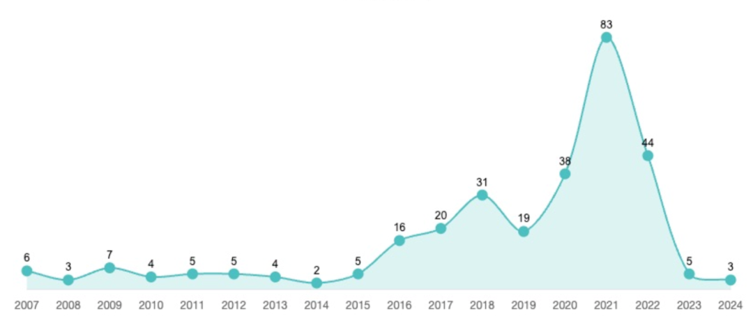 2022 年虽仍有 44 个新账号,但相比峰值明显下降。