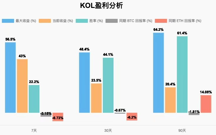KOL 盈利能力分析是以 KOL 在某个时间期限内第一次 X 发帖分析看好某个代币的时间点的代币价格作为买入价。最大收益率指在发帖后,相应时间段内代币最高价除以第一次发帖时候代币的价格。目前收益率指当前代币价格除以第一次发帖时候代币的价格。从图中 KOL 7 天、30 天、90 天胜率的变化可以得知,KOL 们整体的盈利能力与市场情况表现密切相关,且收益情况远超 BTC 和 ETH,可见这些优质 KOL 依旧能够给粉丝带来超额收益。目前可以在 XHunt 的谷歌插件上直接查看 KOL 们的喊单胜率、最大收益率和持有至目前的的收益率。
