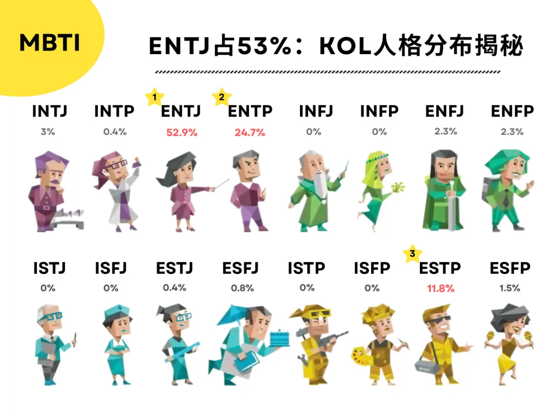 这是一个由 ENTJ(指挥官,52.9%) 主导的群体,这类人格以目标导向、善于规划和掌控局面著称,符合 KOL 在叙事构建与市场引领中的角色定位;