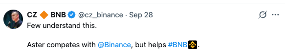 · 公开推广: CZ 多次在 Twitter 上发帖,祝贺 Aster 的代币生成事件( TGE )并推广该项目。正如分析师指出的,“ CZ 很少分享图表”,这使得他对 ASTER 的推广成为一个重要的市场信号。