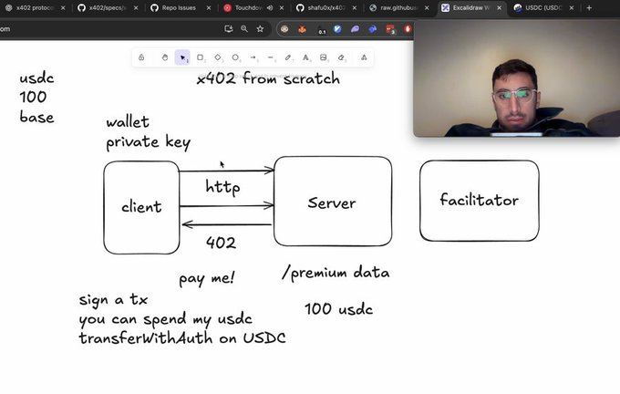 1. 当用户或 AI 访问一个收费资源时,服务器返回 402 状态码,同时告诉你:这个服务要 0.1 USDC,请付款到这个地址。