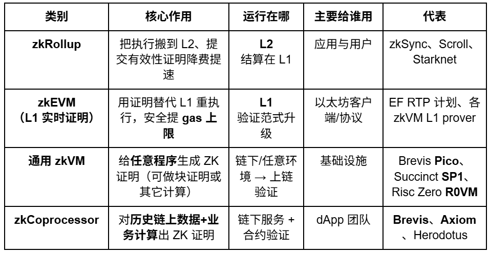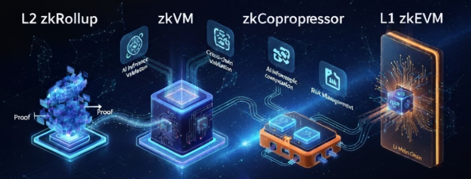 而在以太坊生态之外,零知识证明(ZKP)技术也延伸至更广泛的 通用可验证计算(Verifiable Computing) 领域,形成以 zkVM 与 zkCoprocessor 为核心的两类技术体系。