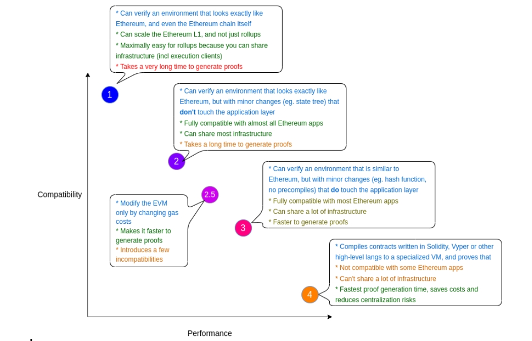 在 2022 年 在 Layer2 生态百花齐放的阶段,以太坊创始人 Vitalik Buterin 提出了 ZK-EVM 四类分类(Type 1–4),系统性揭示了 兼容性(compatibility)与性能(performance)之间的结构性权衡。这一框架为后续 zkRollup 技术路线确立了清晰的坐标: