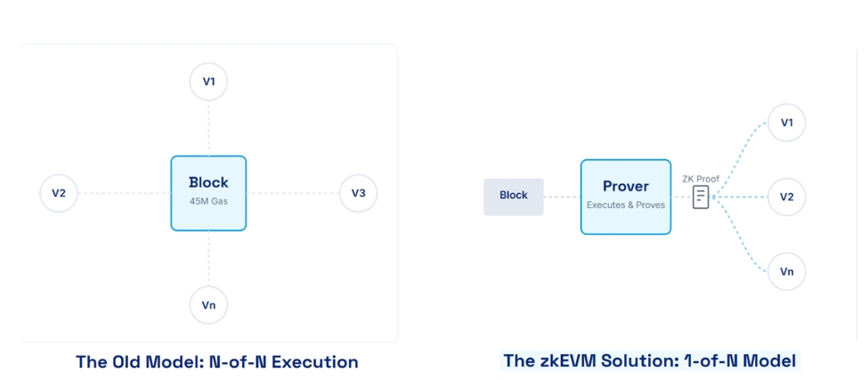 1 of N 新范式:由少数 prover 执行整块并产出短证明;全网只做常数时间验证。验证成本远低于重执行,可安全提高 L1 gas 上限,并减少硬件要求。