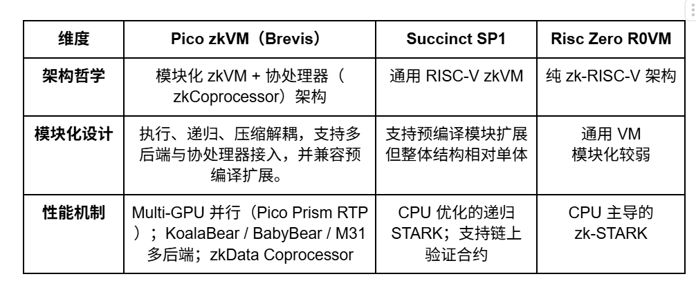 相较于 Succinct SP1 的相对单体化 RISC-V zkVM 架构和 RISC Zero R0VM 的通用 RISC-V 执行模型,Pico 通过 Modular zkVM + Coprocessor System 实现执行、递归与压缩阶段的解耦与扩展,支持多后端切换及协处理器集成,在性能与可扩展性上形成差异化优势。