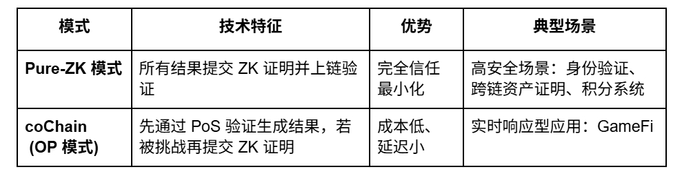 Brevis 同时支持 Pure-ZK 与 CoChain(OP)模型:前者实现完全信任最小化,但成本较高;后者通过 PoS 验证与 ZK 挑战机制,允许以更低成本实现可验证计算。验证者在以太坊上质押,若结果被 ZK 证明挑战成功将被罚没,从而在安全与效率间取得平衡。通过 ZK + PoS + SDK 的架构融合,Brevis 在安全性与效率之间取得平衡,构建出一个可扩展的可信数据计算层。目前,Brevis 已服务于 PancakeSwap、Euler、Usual、Linea 等协议,所有 zkCoprocessor 合作 均基于 Pure-ZK 模式,为 DeFi、奖励分配与链上身份系统提供可信数据支撑,使智能合约真正具备 “记忆与智能”。