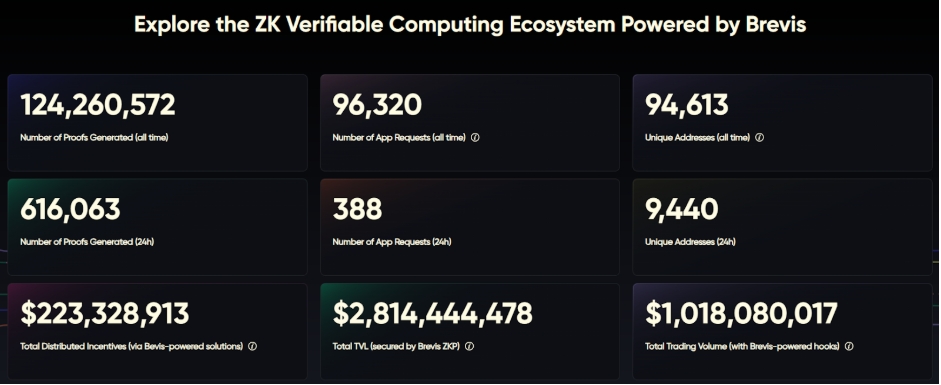 根据 Brevis Explorer 数据,截至 2025 年 10 月,Brevis 网络 已累计生成超 1.25 亿条 ZK 证明,覆盖 近 9.5 万个地址、9.6 万次应用请求,广泛服务于奖励分发、交易验证与质押证明等场景。生态层面,平台累计分发激励约 2.23 亿美元,支撑的 TVL 超 28 亿美元,相关交易量累计突破 10 亿美元。