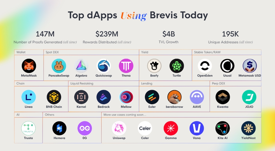在流动性优化方面,PancakeSwap、QuickSwap、THENA、Beefy 等采用 Brevis 的动态费率与 ALM 激励插件,实现交易折扣与跨链收益聚合;Jojo Exchange 与 Uniswap Foundation 则利用 ZK 验证机制构建更安全的交易激励体系。