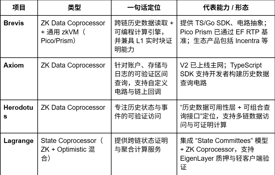 当前 zk-Coprocessor 赛道已形成以 Brevis、Axiom、Herodotus、Lagrange 为代表的格局。 其中 Brevis 以「ZK 数据协处理器 + 通用 zkVM」融合架构领先,兼具历史数据读取、可编程计算与 L1 RTP 能力;Axiom 聚焦可验证查询与电路回调;Herodotus 专注历史状态访问;Lagrange 以 ZK+Optimistic 混合架构优化跨链计算性能。 整体来看,zk-Coprocessor 正以 “可验证服务层” 的方式成为连接 DeFi、RWA、AI、身份 等应用的可信计算接口。