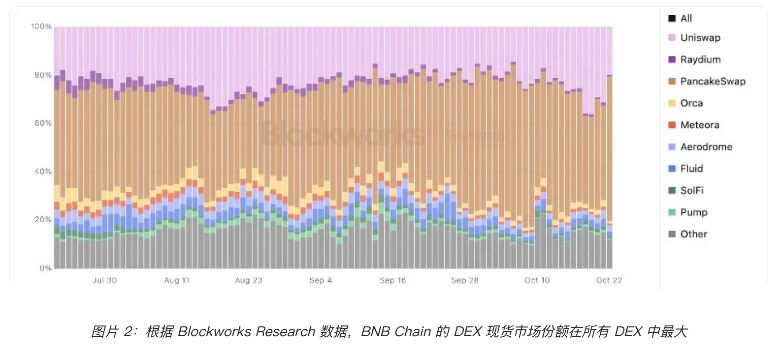 总体而言,BNB Chain 上的 DEX 正在引领去中心化交易领域——尤其是 PancakeSwap——进一步突显了 BNB 在链上流动性及其生态系统发展中的主导地位。
