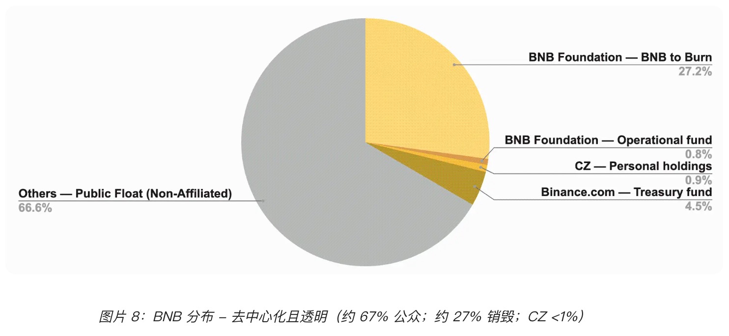 它是一种顶级代币,具有通缩机制和设计。凭借完全流通的供应量和去中心化的链上所有权 (约 67% 为公众持有;约 27% 待销毁;CZ 持有 <1%,数据来源见正文),BNB 有望大幅减少解锁以及中心化风险,从而增强机构信任。