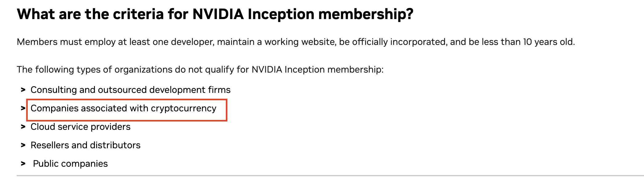 2022 年以太坊转为 PoS 后,GPU 挖矿需求断崖式下跌,英伟达游戏显卡业务很快回归常态供需。黄仁勋也多次强调,公司未来的增长动力将主要来自人工智能、数据中心、自动驾驶等领域,而不再倚重加密货币等投机性业务。可以说,在经历了一轮 “矿卡热” 的高潮与降温之后,英伟达果断地与这个具有高波动性的行业划清了界限,将更多资源投入到更广阔也更有社会价值的 AI 计算版图之中。同时英伟达在最新的面向 AI 初创企业 Inception 计划的官网中也已明确列出 “不符合资格的组织类型”,其中包含 “与加密货币相关的公司,可以看出英伟达明确希望与以往的加密老朋友划清界限。