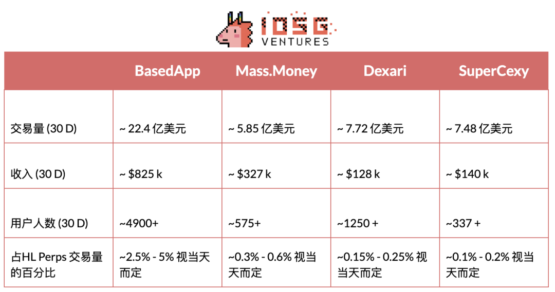 · 基于 HL 的原生移动应用浪潮已开启:BasedApp、Mass.Money、Dexari、Supercexy。这些应用日均交易量达 5 万美元(月重复收入 150 万美元),约占 HL 永续合约交易量的 3-6%,目标用户群体各异(加密原生用户、Web2 零售用户、专业交易者)。
