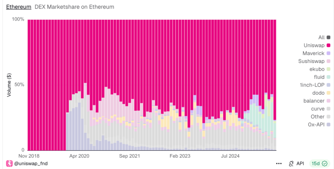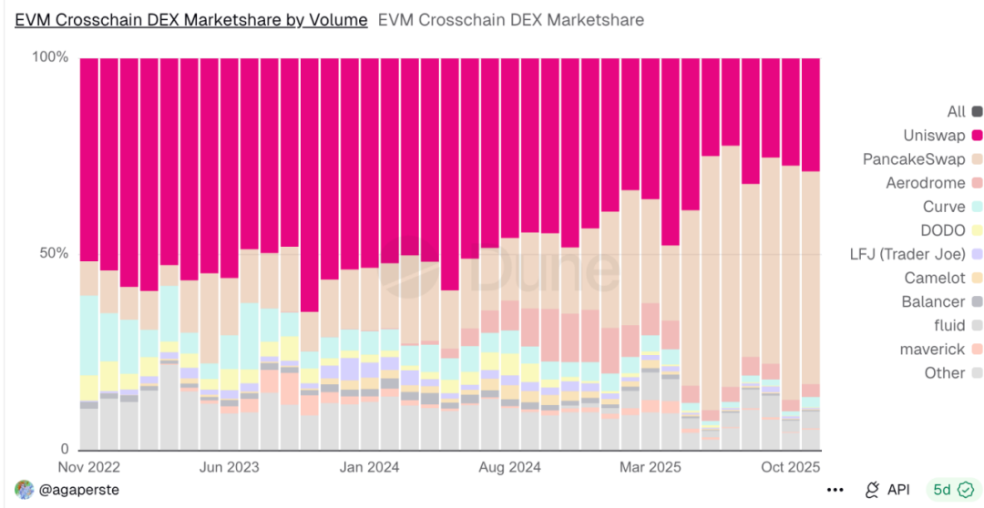 在跨链 Swap 市场中,UniswapX 的实际效果,远逊于竞品 PancakeSwap 在体验上的优化,从 24 年开始,市占率就不断被蚕食。如今也不过是 2、3 成的占有率。