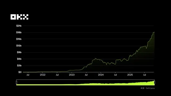 据 DeFiLlama 数据,全球 RWA 总锁仓量 (TVL) 达 181.17 亿美元,延续增长趋势。(注:链上 RWA 总额统计的是所有链上发行的相关代币总价值;而 TVL 特指存放在 DeFi 协议中作为抵押品或生息资产的 RWA 价值。很大一部分 RWA(如贝莱德的 BUIDL)被用户直接持有在钱包里,并未存入 DeFi 协议,因此 TVL 会远小于总发行额。)