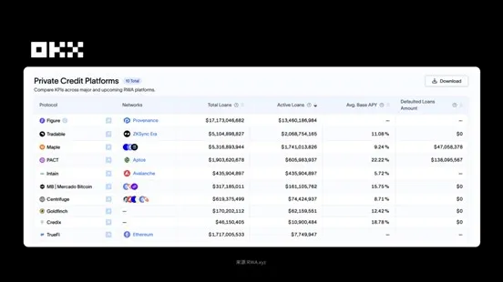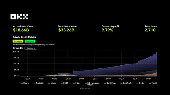 截至 2025 年 11 月 7 日,RWA 领域私募信贷活跃贷款规模约 186.6 亿美元,平均年化利率 9.79%,总贷款笔数 2,710 笔。Figure 平台占据约 92% 市场份额,贷款总额达 172 亿美元;Centrifuge 通过多链架构与 DeFi 协议互通,TVL 从 3.5 亿美元增长至 13 亿美元以上,历史年化收益率 8%-15%。
