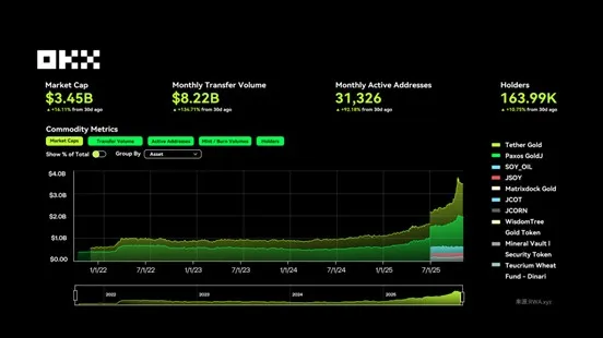 截至 11 月 10 日,当前 RWA 领域的大宗商品类代币呈现出显著的增长态势,总规模从早期不到 10 美元逐步增长至约 35 亿美金、月交易量达 82.2 亿美金、月活跃地址数为 31,326 个、持有者数量为 16.4 万。尤其是黄金类代币表现突出,石油和大豆等大宗商品代币化资产,近期呈现加速上涨趋势,整体市场活跃度和规模都在快速扩张。
