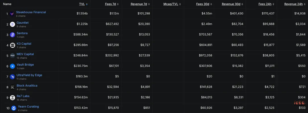 AUM 高度集中,头部的Steakhouse Financial ≈ $1.55B,Gauntlet ≈ $1.23B,前两名合计接近 50% 市场份额,是一个非常典型的幂律结构。