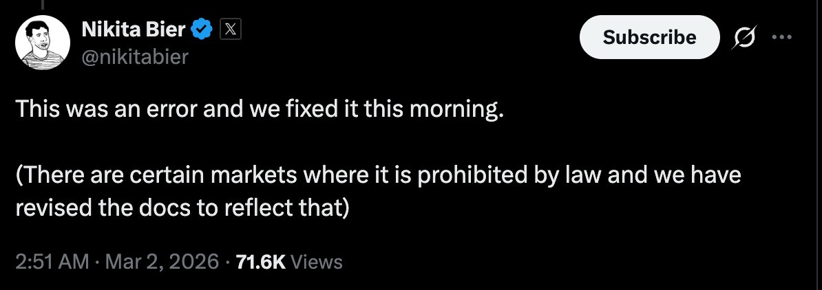 然而,这只是一场乌龙。 X 产品负责人 Nikita Bier 已公开确认,之前一刀切的限制显示是一个错误。此条款在 2024 年 6 月已更新,并非最新版。并且目前平台已经紧急修复了该条款。
