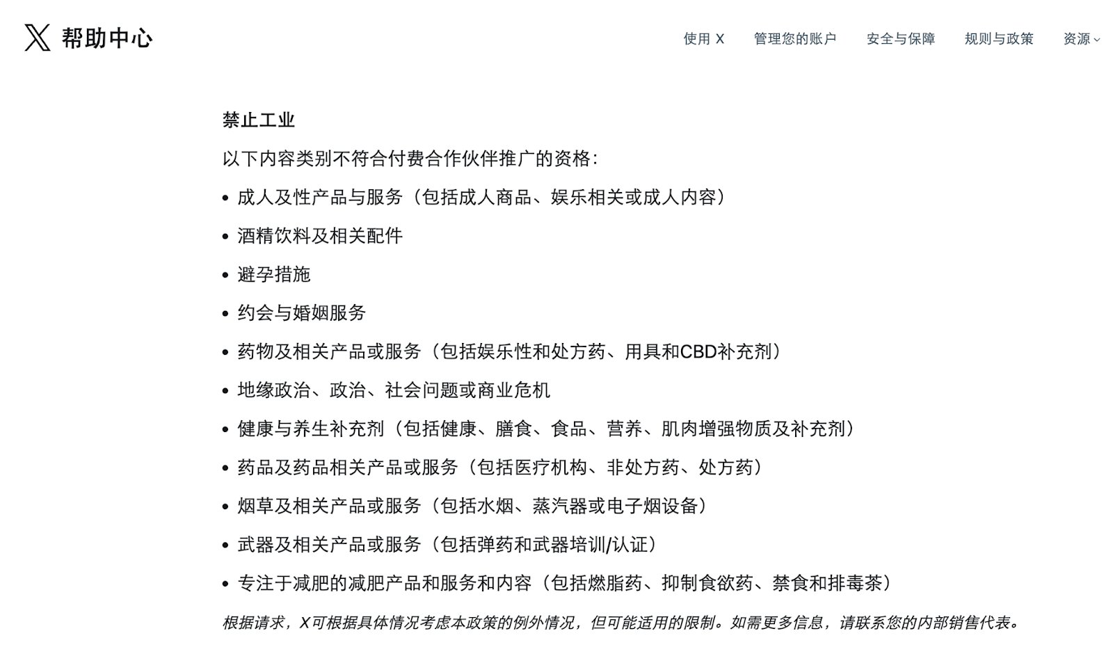 就在新规发布之初,X 政策页面显示 “加密货币(Crypto)” 被直接列为禁止进行付费合作伙伴推广的类别,这在 Web3 圈引发了强烈地震,许多 KOL 辗转反侧夜不能寐,焦虑自己的饭碗被端走了。