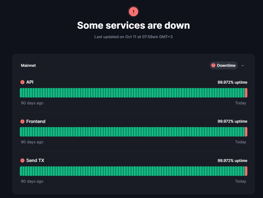 吴说获悉,据 Lighter status,Lighter 主网服务已中断,API、前端和发送交易均中断。Lighter 团队在 12:23 UTC+8 发布了宕机警告,订单无法处理或执行,正在修复问题。Lighter 官推表示,这是一个由于过去 12 小时 TPS 异常高导致的技术问题。