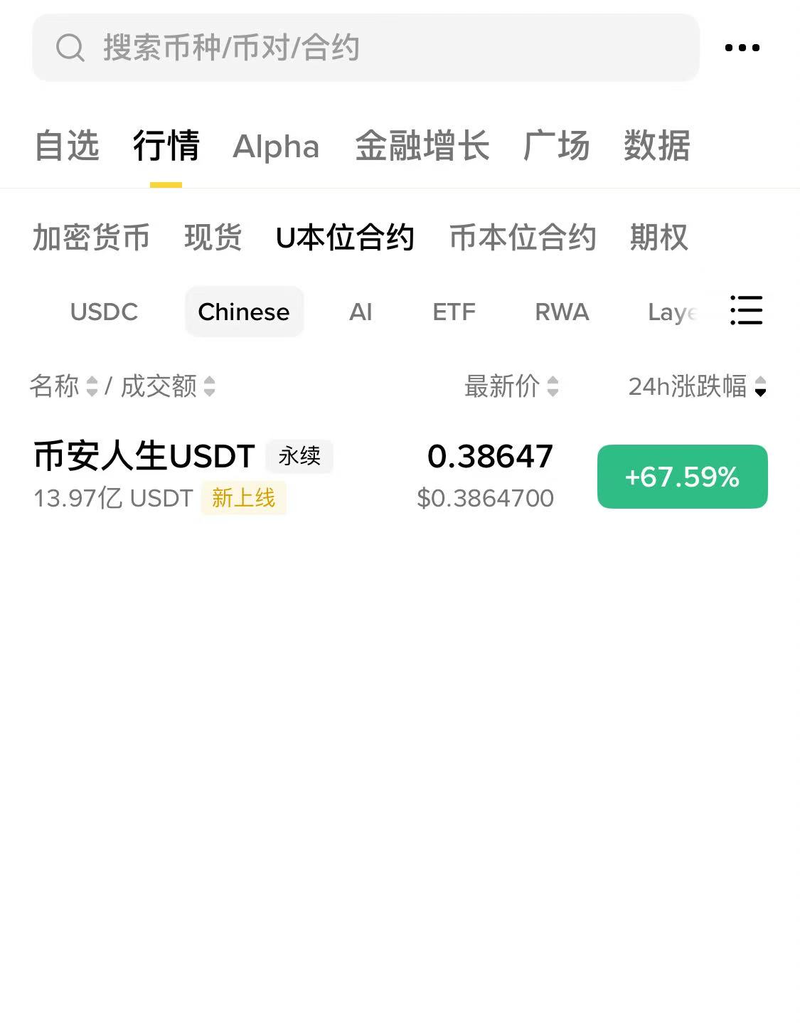吴说获悉,据 Binance App 显示,合约行情页中已新增 “Chinese” 板块,昨日上线合约的 meme 币 “币安人生” 为目前该板块唯一代币。