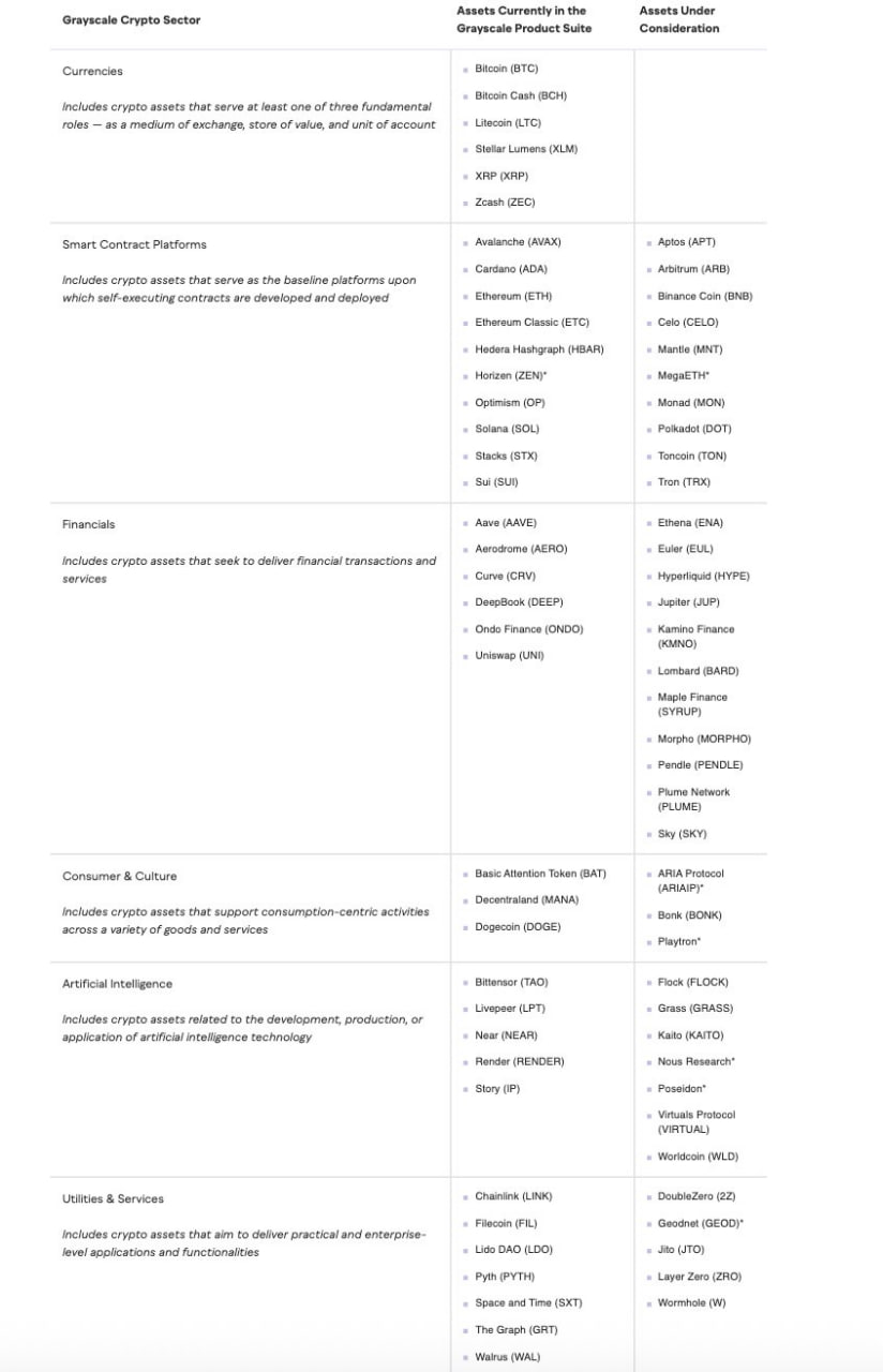吴说获悉,Grayscale 公布了其 2026 年第一季度最新的“观察资产(Assets Under Consideration)”名单,涵盖 36 种潜在山寨币,涉及六大区块链细分领域。与 2025 年第四季度的 32 种资产相比,本次名单小幅扩容。智能合约板块新增了 Tron(TRX);消费与文化板块新增 ARIA Protocol(ARIAIP)。人工智能板块新增了 Nous Research 和 Poseidon,同时移除了 Prime Intellect。公共事业与服务板块则新增了 DoubleZero(2Z)。被列入名单并不代表一定推出产品,但意味着相关资产正处于活跃评估阶段。