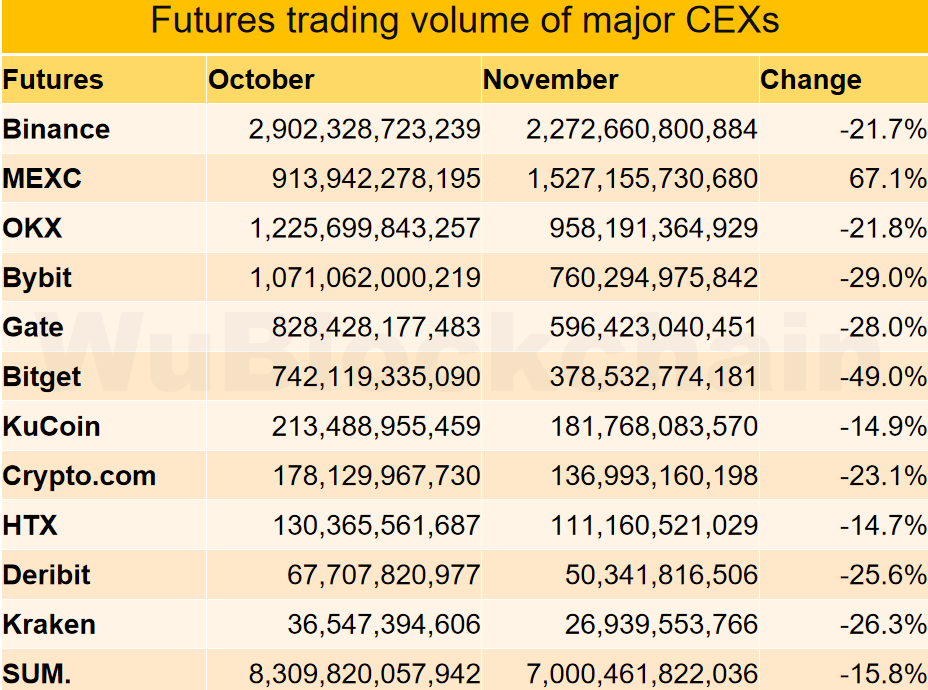11 月主要交易所的衍生品交易量相较 10 月下降 16%。变化率排名前三名为 MEXC +67%、HTX -15% 与 KuCoin -15%。排名后三名为 Bitget -49%、Bybit -29% 与 Gate -28%。