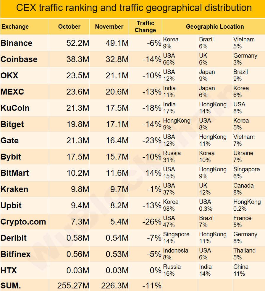 11 月主要交易所的网站浏览量相较 10 月下降 11%。变化率排名前三名为 BitMart +14%、Kraken -1% 与 Bitfinex -5%。排名后三名为 Crypto.com -26%、Gate -23% 与 KuCoin -18%。