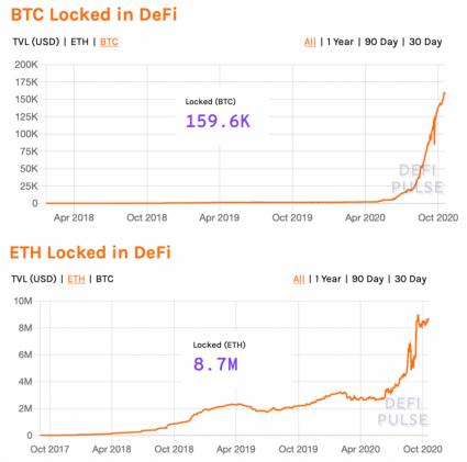 DeFi Pulse的数据显示,目前,锁定在DeFi中的以太币价值32亿美元,占以太坊总市值的7.6%,BTC锁定的金额为18亿美元,占比特币总市值的0.85%。