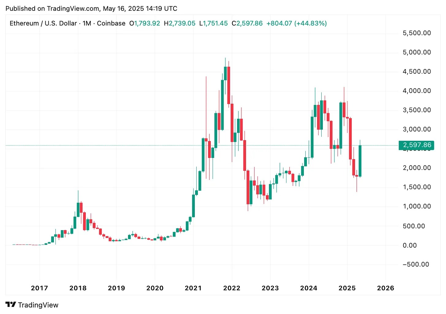 该平台的价格图表讲述了一个剧烈波动的故事——从推出时的几美分到 2021 年 11 月的近 4900 美元,再到 2022 年的加密寒冬跌至 1000 美元以下,如今稳定在 2605 美元。十年来,这些波动考验着 ETH 支持者的决心,他们经历了承诺的升级、延期的时间表以及技术转型。