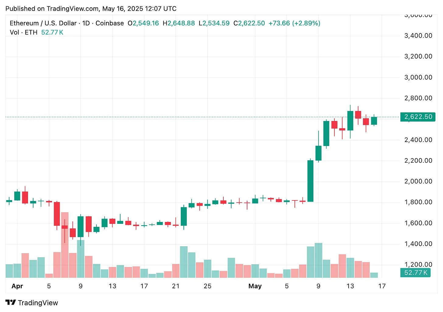 对验证者而言,此次升级将最大质押限额从 32 ETH 提高到惊人的 2048 ETH,大幅降低了机构质押者的运营成本。这些改进推动了 ETH 摆脱了近期的价格低迷,从 4 月中旬的约 1615 美元攀升至今天的 2600 美元以上,涨幅超过 60%。