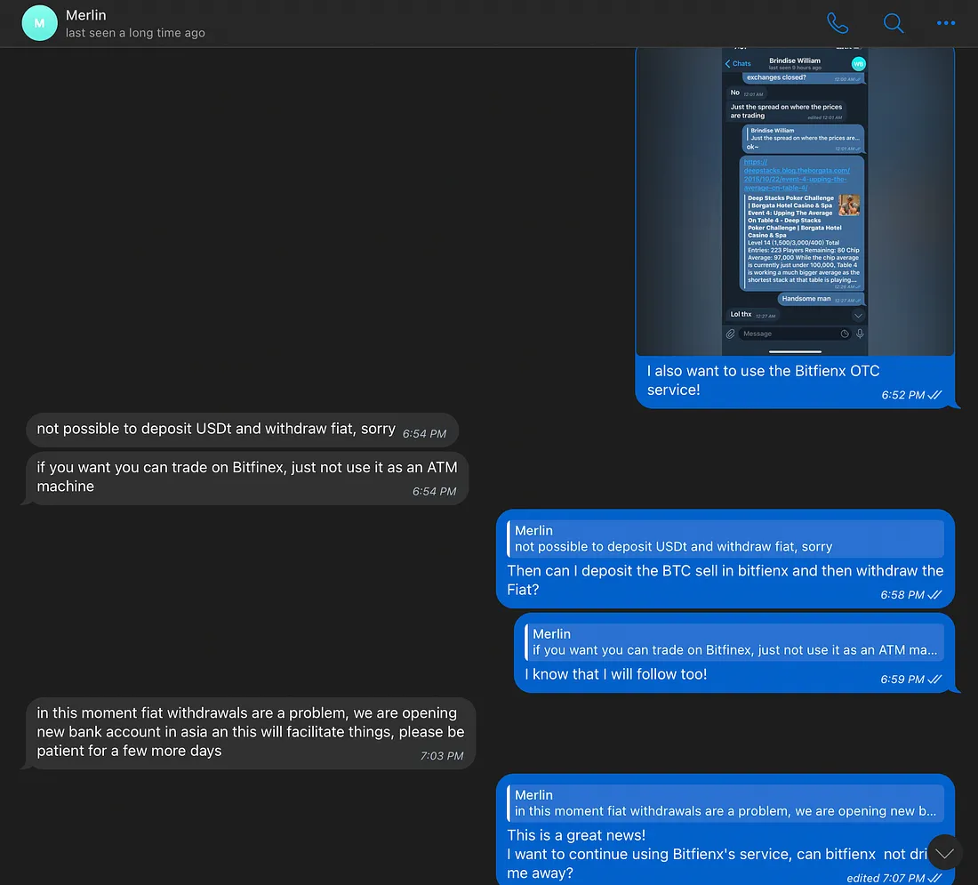 我在早期 2019 年 2 月份的时候也透过 Telegram 跟 Giancarlo 发送讯息,当时候我想要跟 Bitfienx 进行 OTC 的交易。