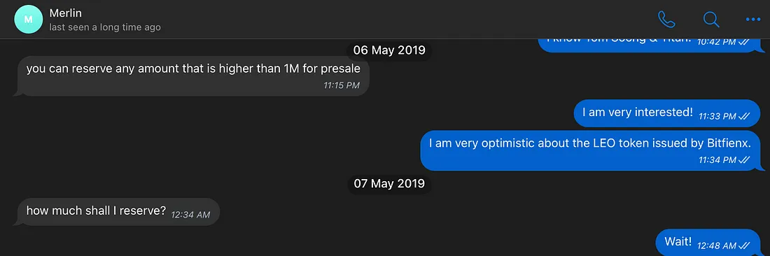 当时候我跟 Devasini 谈预售的情况,最低至少要购买等值一百万美金的 LEO 代币。